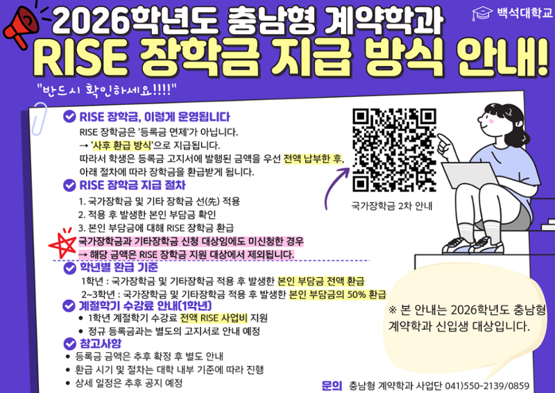 또한 1학년 계절학기 수강료는 전액 RISE 사업비로 지원되며, 등록금 환급 시기 및 절차는 대학 내부 기준에 따라 진행되며, 문의: 충남형 계약학과 사업단 ※ 본 안내는 2026학년도 충남형 계약학과 신입생 대상입니다. |