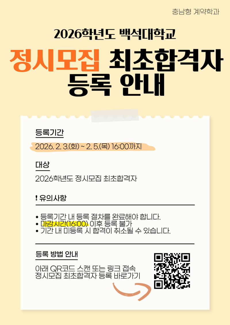 ![]() 안녕하세요. 2026학년도 백석대학교 정시모집 최초합격자를 대상으로