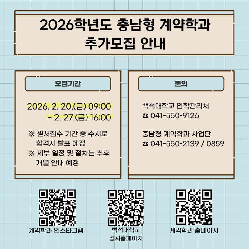 ![]() 2026학년도 충남형 계약학과 신입생 추가모집을 아래와 같이 안내드립니다.